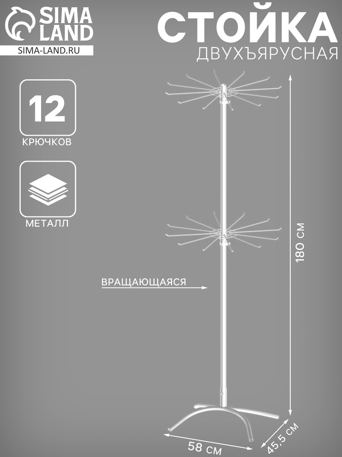 - Два яруса по 12 штырей каждый обеспечивают достаточно места для размещения разнообразной продукции, от одежды до аксессуаров.
